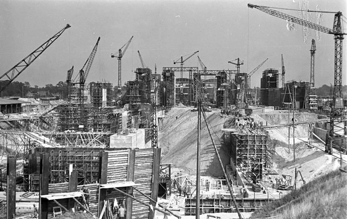 Überblick auf die Turmdrehkräne auf dem Bau der „Valenti“-Baustelle im Jahr 1944: Foto: Bundesarchiv/CC BY-SA 3.0 de