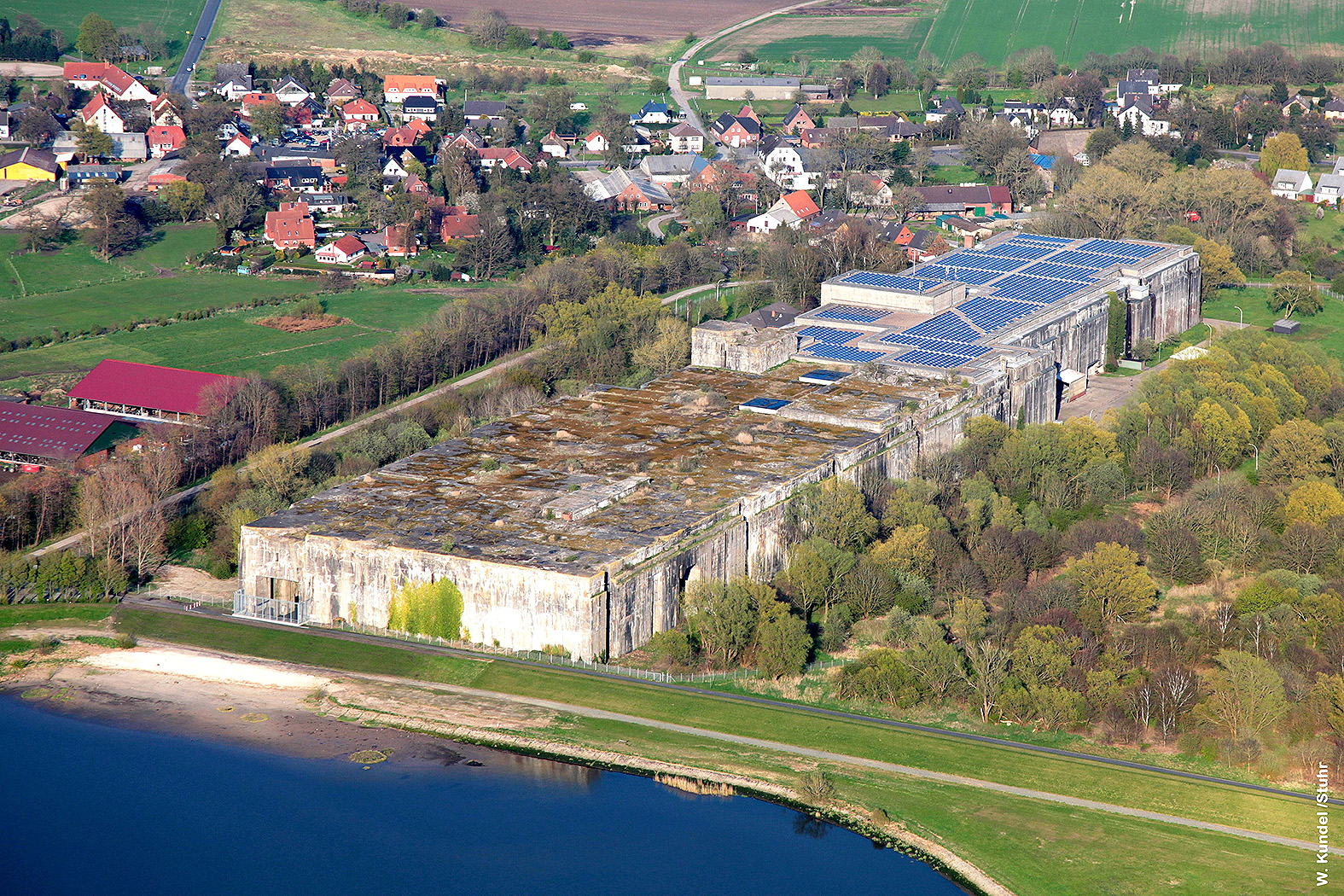 Es ist wahrlich ein Monstrum mit riesigen Ausmaßen: rund 420 Meter lang, im Osten 67 und im Westen 97 breit. Die Außenhöhe beträgt 20 bis 22 Meter. Wo die Decke erhöht wurde, kommen gut zehn Meter hinzu. Dieses Monstrum steht im Bremer Ortsteil Farge-Rekum an der Weser, gleich an der Landesgrenze zu Niedersachsen. „Valentin“ heißt es, erdacht von den Nationalsozialisten. Dieses war der Tarnname der geplanten verbunkerten U-Boot-Werft. Dort sollten die auf den deutschen Werften zuvor gebauten Sektionen des U-Boot-Typs XXI zusammengesetzt und direkt von der Unterweser aus auf Feindfahrt gehen.